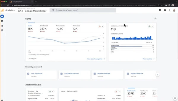 Panel raportów w panelu Google Analytics, źródło: youtube.com/watch?v=NHXeDuZ2lf0.