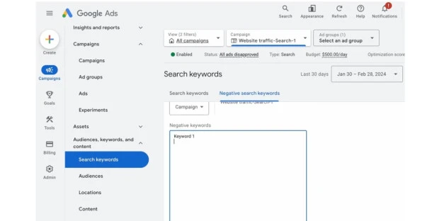 Regularnie przeglądaj swoje negatywne słowa kluczowe i usuwaj te, które mogą blokować wartościowe źródła ruchu. W wielu przypadkach warto przetestować selektywne zdejmowanie części wykluczających słów kluczowych, szczególnie gdy kampanie generują dużo konwersji i masz przestrzeń do dalszej optymalizacji kosztu kliknięcia.