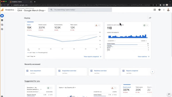 Panel raportów w panelu Google Analytics, źródło: youtube.com/watch?v=NHXeDuZ2lf0.