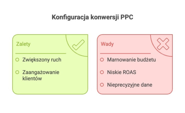 Częstym błędem, który może osłabić skuteczność kampanii PPC, jest błędna konfiguracja konwersji. Zdarza się, że kampanie optymalizują się pod cele, które są dalekie od zamierzonych, np. zamiast skupiać się na sprzedaży, system optymalizuje kampanię pod zapisy na newsletter. Choć zapis na newsletter może być istotny, to nie jest to cel końcowy w przypadku kampanii nastawionych na sprzedaż, co może prowadzić do marnowania budżetu na działania o niższej wartości. Kampania nie osiąga oczekiwanych wyników, a dane o konwersjach stają się mniej precyzyjne, co skutkuje niższym ROAS.