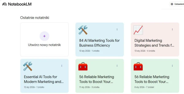 NotebookLM analizuje wyłącznie dokumenty, które sam mu dostarczysz - raporty, PDF-y czy notatki - i tworzy z nich podsumowania, wnioski i wyrywki. Możesz używać go, aby szybciej analizować strategie konkurencji, porównywać trendy w Twojej branży, tworzyć briefy i konspekty lub przygotowywać argumenty na potrzeby kampanii marketingowych. Narzędzie skupia się na dostarczonych materiałach, co zapewnia rzetelność analiz.