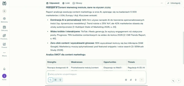Perplexity AI to wyszukiwarka i asystent badawczy, który łączy generowanie odpowiedzi z aktywnym cytowaniem aktualnych źródeł internetowych. W marketingu służy do analizy trendów, zbierania informacji o rynku i konkurencji oraz monitoringu zachowań konsumentów. Narzędzie wskazuje, skąd pochodzą dane, co jest przydatne przy weryfikacji faktów przed publikacją treści oraz przygotowywaniu analiz SWOT.