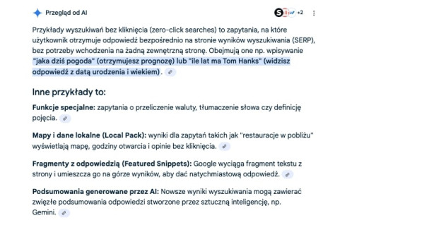 Zero-click search to sytuacja, w której użytkownik otrzymuje kompletną odpowiedź bez konieczności odwiedzania żadnej strony. W kontekście AI Search to zjawisko staje się normą: modele generatywne dostarczają gotowe streszczenia i rekomendacje, ograniczając tradycyjny ruch organiczny. Marki mogą być widoczne bezpośrednio w odpowiedziach AI, nawet jeśli użytkownik nie kliknie link. Kluczem jest tu AEO i GEO, które pomagają treściom być cytowanymi w samych wynikach generatywnych, nie tylko w klasycznych SERP-ach. Czytaj więcej o zero-click searches.