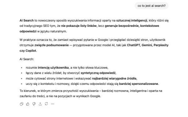 AI Search to nowa generacja wyszukiwarek, które wykorzystują sztuczną inteligencję do rozumienia języka naturalnego i kontekstu zapytań. Zamiast tradycyjnych list linków, jak w Google, oferują użytkownikowi syntetyczne, spersonalizowane odpowiedzi, oparte na analizie danych z wielu źródeł. Systemy takie jak Google AI Overviews, Bing Copilot czy Perplexity AI łączą funkcje wyszukiwania, analizy i generowania treści. AI Search potrafi rozpoznać intencję pytania, zinterpretować jego znaczenie i przedstawić zwięzłe podsumowanie wraz z odniesieniami do źródeł. Użytkownik nie przegląda wyników, lecz prowadzi rozmowę z inteligentnym asystentem, który rozumie, czego naprawdę szuka.