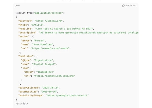 Schema Markup to język danych strukturalnych, który pozwala wyszukiwarkom i modelom AI lepiej zrozumieć zawartość strony. Umieszczony w kodzie HTML, opisuje, czym są poszczególne elementy: artykuł, produkt, autor, opinia czy wydarzenie. Dzięki temu treści mogą być poprawnie interpretowane i prezentowane w wynikach generatywnych. W kontekście AI Search dane strukturalne wspierają precyzyjne cytowanie fragmentów i lepsze rozpoznawanie kontekstu. Schema nie wpływa bezpośrednio na ranking, ale ułatwia AI ocenę wiarygodności i użyteczności strony. To podstawa tzw. technicznego zrozumienia treści przez sztuczną inteligencję. Dowiedz się więcej o danych strukturalnych.