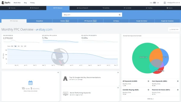 SpyFu umożliwia wyszukiwanie informacji o słowach kluczowych i kampaniach PPC konkurencji. Możesz dowiedzieć się: