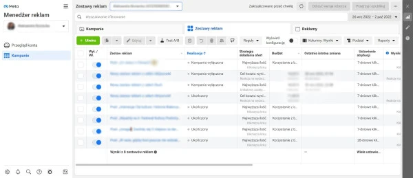 Przejdź w tym celu pod link https://adsmanager.facebook.com/adsmanager/. Powinny Ci się wyświetlić realizowane przez Ciebie treści pogrupowane w kampanie, zestawy reklam oraz reklamy. Analizy dokonuj z poziomu zestawu reklam - ta sekcja znajduje się na środku. Twoim celem jest sprawdzenie, jak sobie radzą wybrane przez Ciebie grupy docelowe i czy przynoszą Ci pożądane efekty, a najbardziej miarodajne wyniki, dotyczące tych aspektów, dostaniesz właśnie w tej sekcji.