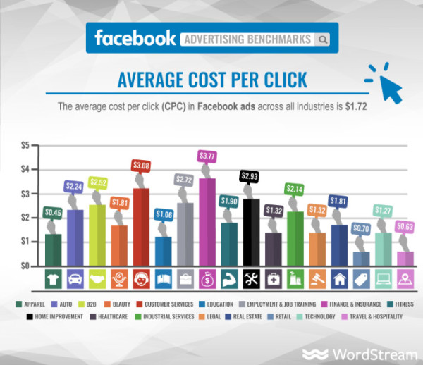 Średni koszt CPC na Facebooku z podziałem na branże, źródło: wordstream.com/blog/ws/2017/02/28/facebook-advertising-benchmarks
