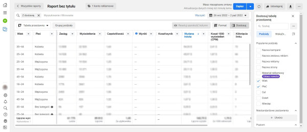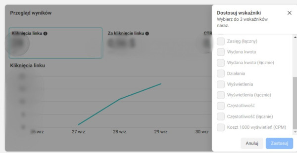 Dostosowanie wskaźników przy analizie reklamy na Facebooku.