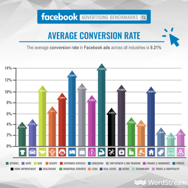 Średni współczynnik konwersji na Facebooku z podziałem na branże. Źródło: wordstream.com/blog/ws/2017/02/28/facebook-advertising-benchmarks