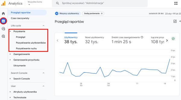 Raport pozyskania użytkowników dostarcza informacji o nowych odwiedzających Twoją stronę internetową. Jest to szczególnie przydatne w analizie kampanii, które skupiają się na pozyskiwaniu nowych klientów lub zwiększaniu świadomości marki. Ten raport ujawnia, w jaki sposób kampanie przyciągają nowych użytkowników do Twojej strony, co pozwala lepiej zrozumieć skuteczność działań marketingowych.