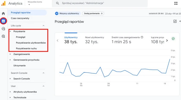 Aby sprawdzić wyniki swoich kampanii na Facebooku Ads w Google Analytics 4, kliknij raporty i rozwiń sekcję pozyskanie. Następnie wyświetlą się trzy opcje: