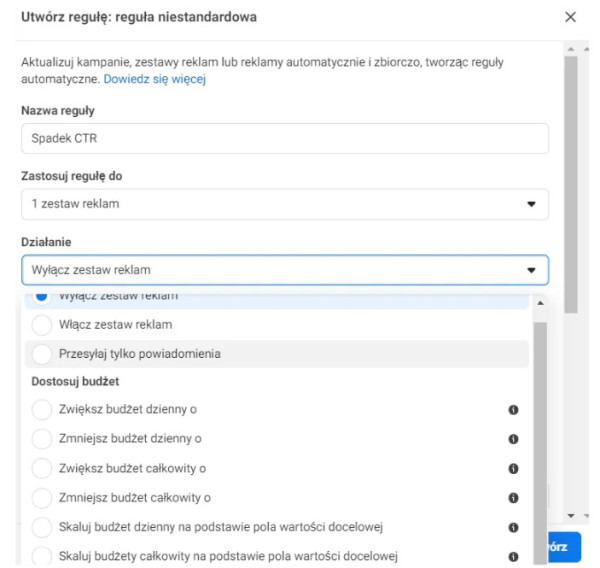 Przykładową regułą automatyczną, która może okazać się dla Ciebie skuteczna jako KPI na Facebooku, jest badanie poziomu CTR (współczynnik klikalności). Pokażemy Ci, jak ją zrealizować.