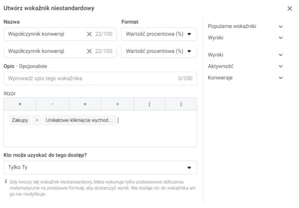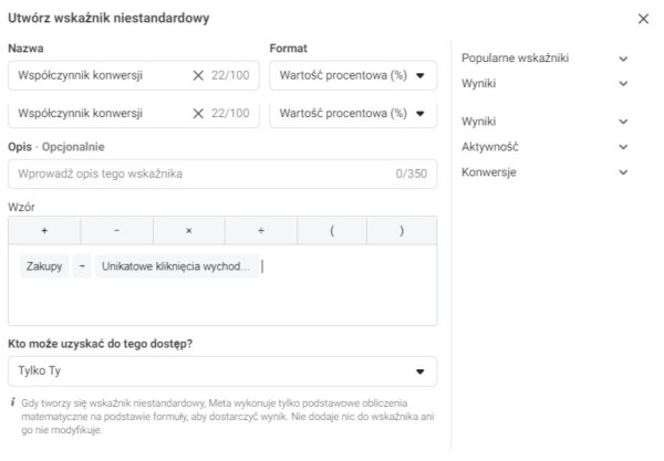 - Nadaj nazwę wskaźnikowi (np. "Współczynnik konwersji").