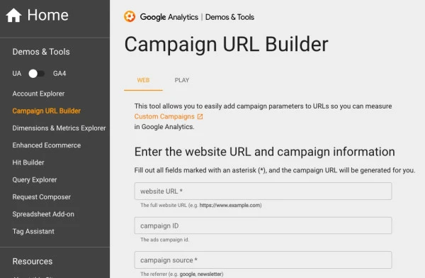 Panel narzędzia Campaign URL Builder.