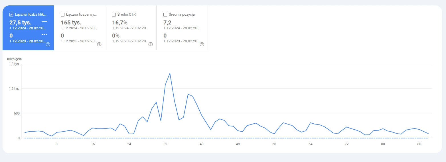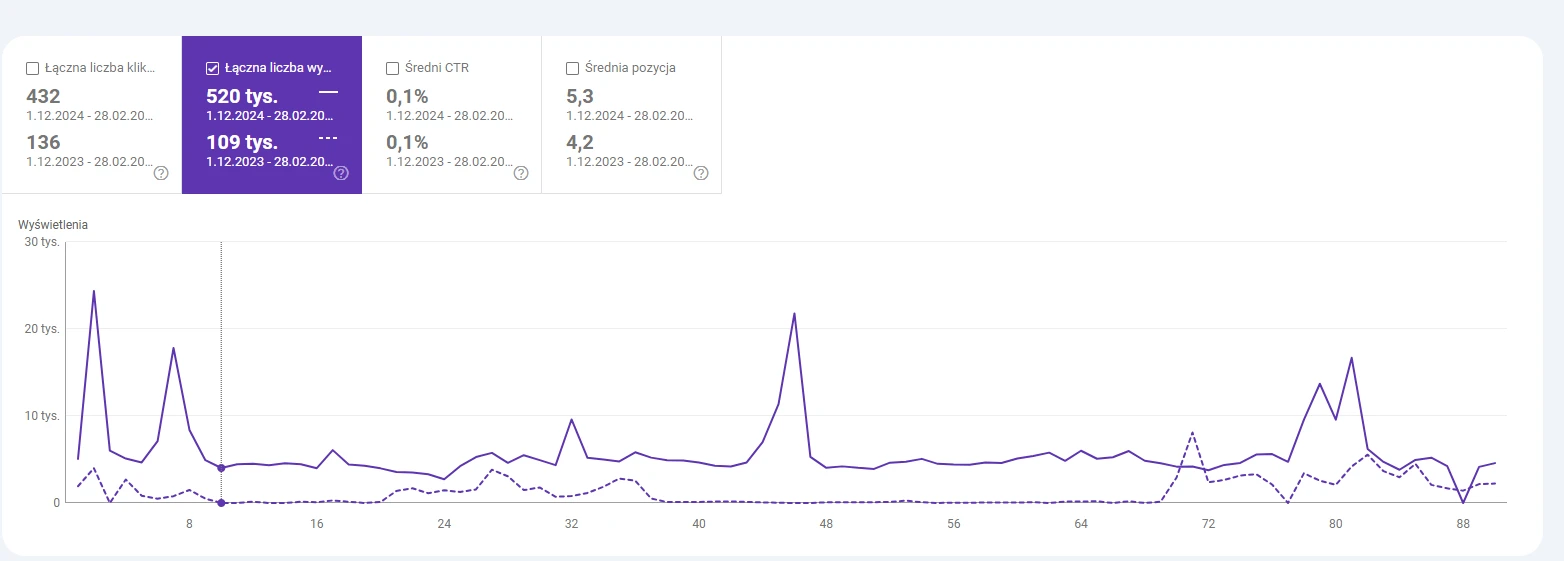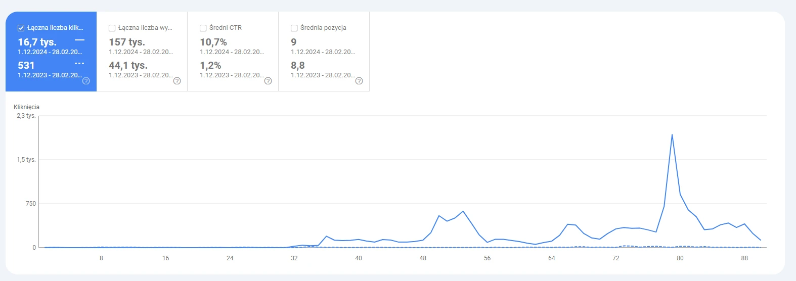 Dzięki przemyślanej strategii SEO i skutecznej optymalizacji poznan.pl odnotowało znaczący wzrost zarówno pod względem wyświetleń, jak i kliknięć. Te liczby to nie przypadek – to efekt konsekwentnej pracy i dostosowania treści do potrzeb użytkowników. To dowód na to, że dobrze zaplanowane działania przynoszą wymierne rezultaty!