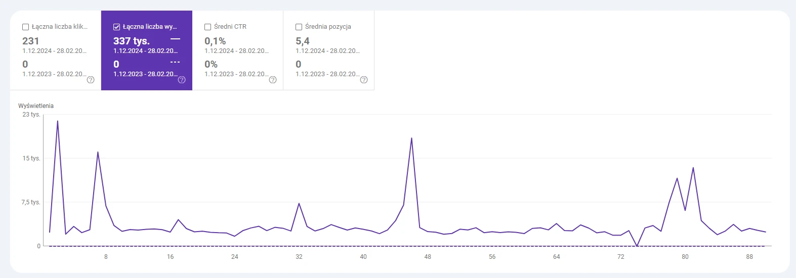 Większa widoczność w Google to nie tylko więcej kliknięć, ale też ogromny wzrost liczby wyświetleń. W tym przypadku też porównaliśmy ostatnie trzy miesiące współpracy, do tego samego okresu rok temu. Zobacz, jakie spektakularne wyniki zanotowaliśmy: