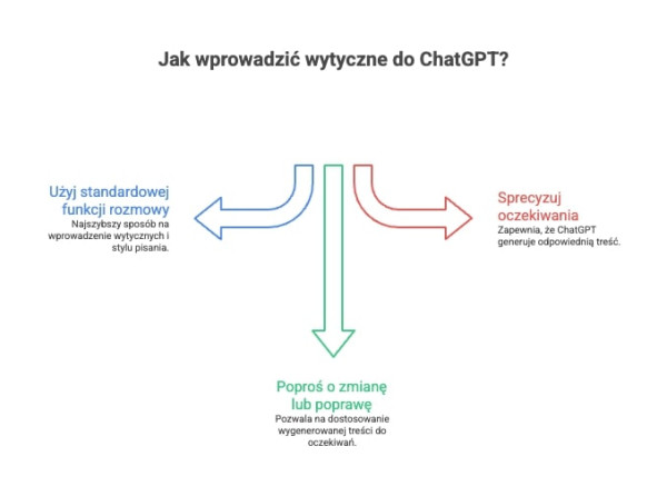 Wytyczne możesz wprowadzać podczas standardowej funkcji rozmowy z ChatGPT. To najszybszy sposób, by nauczyć ChatGPT Twojego stylu pisania lub przekazać mu dane zawierające miarodajne próbki Twoich oczekiwań. Przygotuj prompt, w którym wprowadzisz ważne dla Ciebie informacje i poczekaj na odpowiedź. Jeśli wygenerowana treść Cię nie satysfakcjonuje, możesz poprosić narzędzie o zmianę, poprawienie, czy wygenerowanie nowej odpowiedzi. W takiej sytuacji warto sprecyzować swoje oczekiwania, by ChatGPT mógł przygotować właściwą treść.