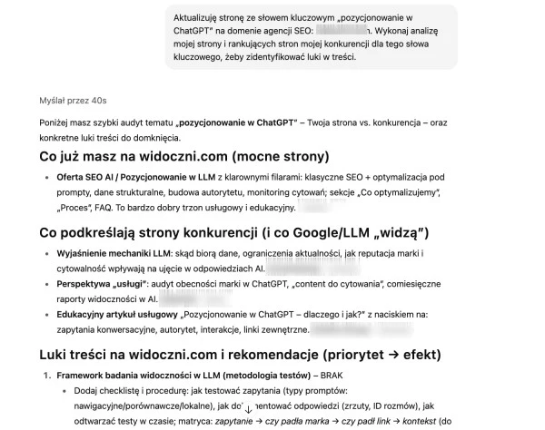 Aktualizuję stronę ze słowem kluczowym „pozycjonowanie w ChatGPT” na domenie agencji SEO: [adres strony]. Wykonaj analizę mojej strony i rankujących stron mojej konkurencji dla tego słowa kluczowego, żeby zidentyfikować luki w treści.
