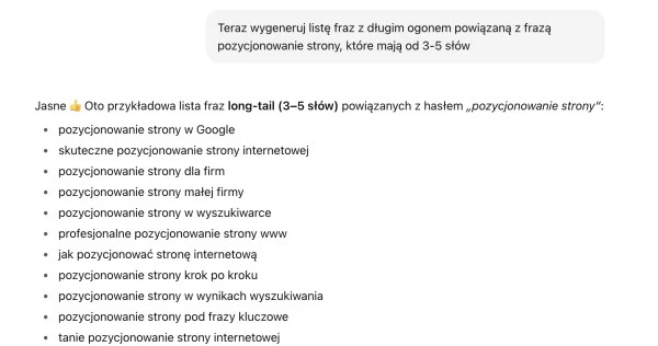 Możesz także zawęzić obszar wyszukiwania, instruując narzędzie co do długości wybranych fraz - np. poproś ChatGPT, by znalazł frazy long tail, które składają się z 3-5 słów.