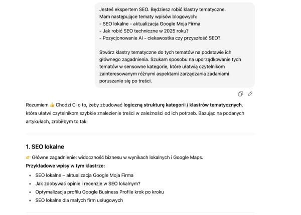 Podział słów kluczowych w ChatGPT na klastry tematyczne