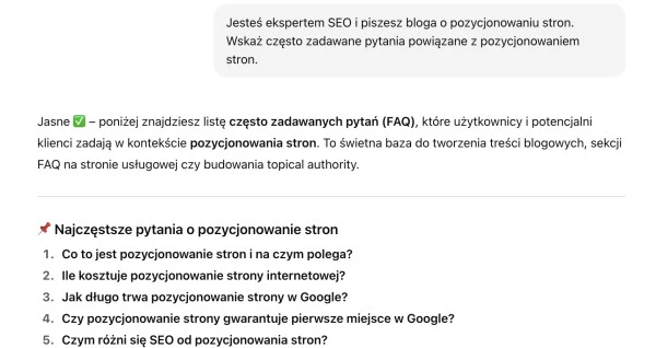 Popularne pytania wygenerowane przez ChatGPT dla frazy "Pozycjonowanie stron"