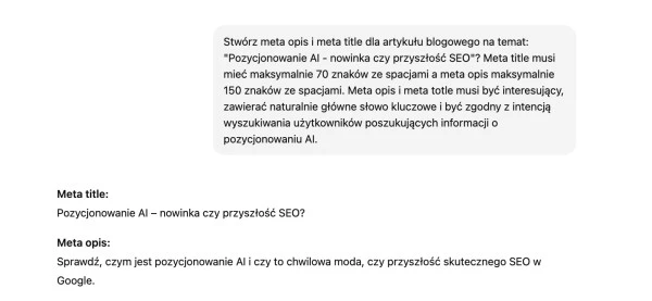 ChatGPT znakomicie sprawdzi się do tworzenia meta title i description na potrzeby konkretnych treści i adresów URL. Wystarczy odpowiedni komunikat, by w efekcie otrzymać gotowe title i description do wykorzystania. Możesz wkleić w okno wyszukiwania swój tekst i poprosić ChatGPT o przygotowanie dla niego tytułu i opisu strony. Pamiętaj o uwzględnieniu w komunikacie limitu znaków. Co więcej, nie musisz wklejać w okno wyszukiwania tekstu. Narzędzie działa w przypadku, gdy poprosisz je o przygotowanie meta title i description dla treści na określony temat.