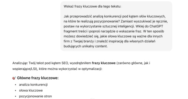 Jak przeprowadzić analizę konkurencji pod kątem słów kluczowych, na które te realizują pozycjonowanie? Zamiast wyszukiwać je ręcznie, postaw na wykorzystanie sztucznej inteligencji. Wklej do ChatGPT fragment treści i poproś narzędzie o wskazanie fraz. W ten sposób możesz dowiedzieć się, jakie słowa kluczowe są ważne dla innych firm z Twojej branży i znaleźć inspirację dla własnych działań budujących unikalny content.