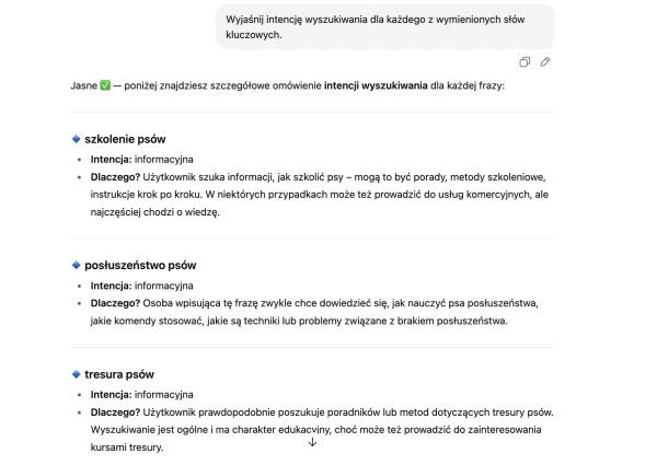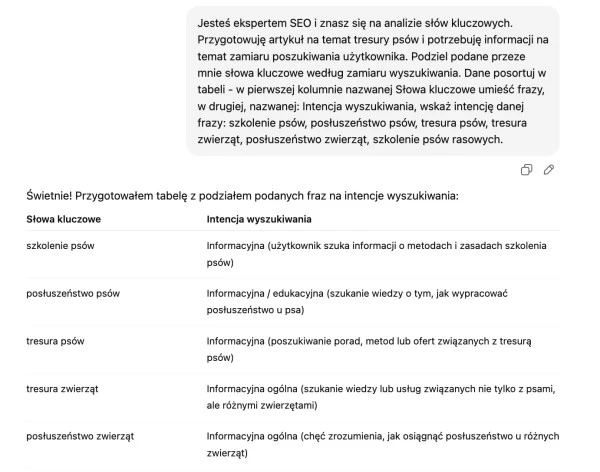 Podział słów kluczowych w ChatGPT według intencji wyszukiwania