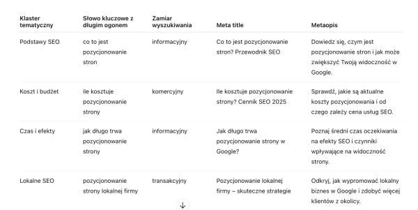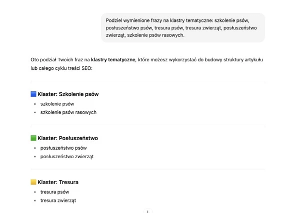 W analizie słów kluczowych ważne jest grupowanie fraz w klastry tematyczne. Pozwala to budować lepszą strukturę strony w pozycjonowaniu oraz strukturę linków wewnętrznych. Wygenerowane przez ChatGPT klastry tematyczne znajdziesz poniżej: