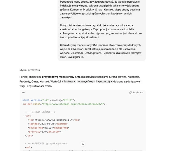 Przykładowa mapa witryny w ChatGPT.
