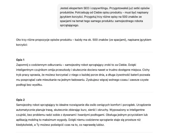 Przykłady opisów produktu -samojezdnego robota sprzątającego wygenerowane przez ChatGPT