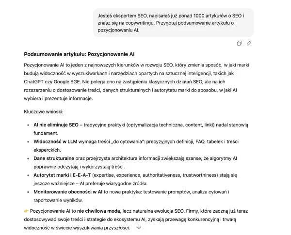 Zdarza się, że ChatGPT posługuje się jednocześnie frazami w języku polskim i angielskim, to jednak mimo to samo narzędzie będzie użyteczne dla specjalisty SEO realizującego pozycjonowanie stron na polskim rynku.