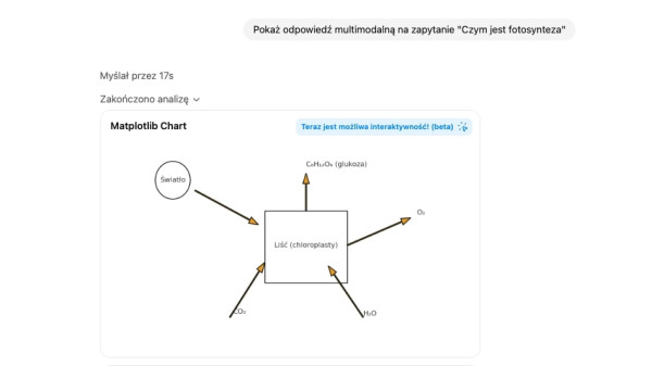 Multimodalność to ogromna zaleta ChatGPT. Oznacza to, że sztuczna inteligencja potrafi odczytywać zarówno tekst, jak i obrazy, wideo czy dźwięk. Potrafi przeanalizować takie treści, ale może również odpowiadać za ich pomocą. W wersji GPT-5 multimodalność została poprawiona jeszcze bardziej, dzięki czemu ChatGPT z łatwością odpowiada za pomocą tekstu, obrazu, wykresu i innych form przedstawiania treści. To wszystko otrzymujemy dzięki zdolności sztucznej inteligencji do przedstawiania syntetycznych odpowiedzi, w ramach których otrzymujemy kilka różnych wyników w odpowiedzi na jedno zapytanie. Nie musimy wtedy manualnie sprawdzać każdego linku jak w wyszukiwarce.