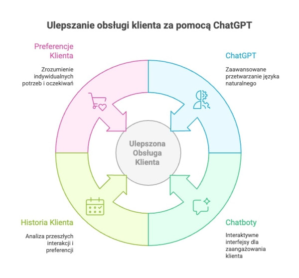 ChatGPT, dzięki swoim zaawansowanym funkcjom przetwarzania języka naturalnego, umożliwia Ci spersonalizowanie obsługi klienta, np. poprzez integrację z systemami chatbotów. Ta synergia pozwala na tworzenie bardziej interaktywnych i responsywnych interfejsów, które będą rozpoznawać intencje użytkowników, dostosowywać odpowiedzi i oferować pomoc dopasowaną do indywidualnych potrzeb i preferencji Twoich klientów. Chatboty zasilane przez chat OpenAI mogą na przykład analizować historię interakcji klientów, ich wcześniejsze zapytania oraz preferencje zakupowe, co pozwoli Ci oferować spersonalizowane rekomendacje, szybką pomoc w rozwiązywaniu problemów czy nawet zarządzać zamówieniami i rezerwacjami w sposób automatyczny. Dzięki temu Twoja firma może znacznie podnieść jakość obsługi, zwiększyć zadowolenie klientów i poprawić efektywność operacyjną swoich serwisów. Personalizacja ta nie tylko umacnia lojalność Twoich klientów, ale również pozwala na lepsze zrozumienie ich potrzeb i oczekiwań. Czytaj więcej o pracy z ChatGPT w ramach komunikacji z klientem.