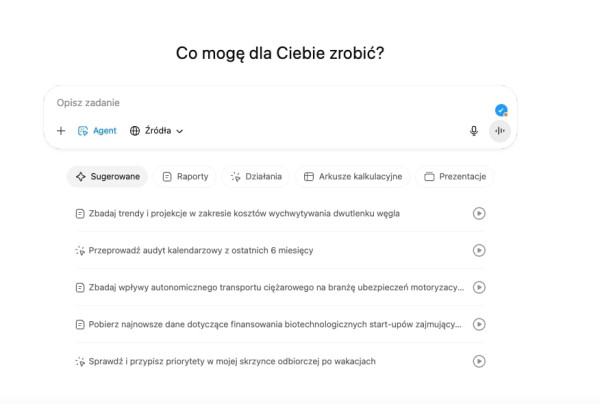 - Tryb agenta i głęboki research (Deep Research) - agent potrafi przechodzić od rozumowania do działania: nawigować po stronach, wypełniać formularze, pracować na plikach i cytować źródła. Głęboki research prowadzi wieloetapowe kwerendy i składa zweryfikowany raport,