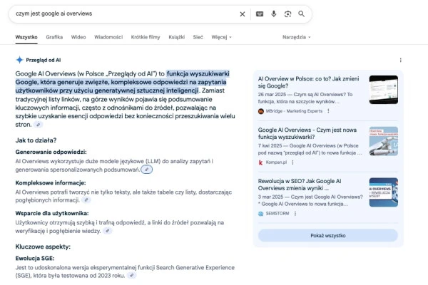 AI Overviews, znane wcześniej jako Search Generative Experience, to moduł, który generuje krótkie podsumowania na górze wyników i dołącza do nich źródła. Użytkownik widzi najważniejsze informacje z danego tematu oraz linki prowadzące do jego pogłębienia. To skraca drogę do uzyskania odpowiedzi i zwiększa rolę cytowanych stron. Od marca 2025 roku Google obsługuje ponad 5 bilionów wyszukiwań rocznie, więc nawet niewielka zmiana układu wyników ma ogromny wpływ na zachowania użytkowników.