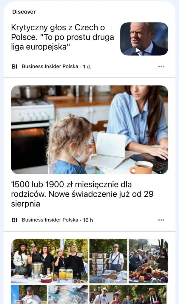 Przykładowe wyniki w Google Discover.