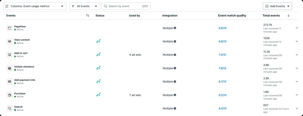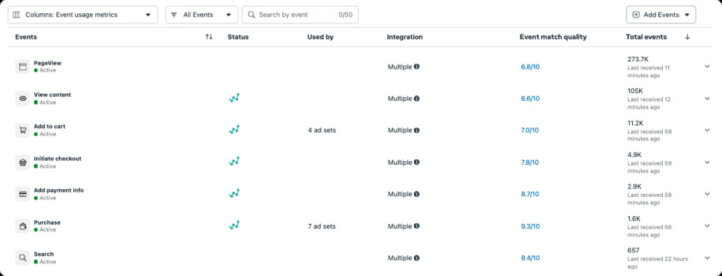 Warto skupić się wyłącznie na zdarzeniach istotnych z perspektywy biznesowej. Nadmiar zdarzeń nie poprawia wyników, a może utrudnić analizę danych marketingowych. Meta umożliwia tworzenie wielu niestandardowych zdarzeń w jednym koncie reklamowym, które można modyfikować lub usuwać w zależności od potrzeb.