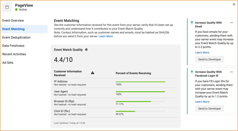 Zdarzenia rejestrowane wyłącznie przez Pixel w przeglądarce często osiągają niższy poziom dopasowania, zwłaszcza przy ograniczeniach cookies i blokadach po stronie użytkownika. Połączenie zdarzeń przeglądarkowych z danymi przesyłanymi przez Conversions API pozwala znacząco poprawić Event Match Quality, ponieważ Meta może zestawić informacje z różnych źródeł.