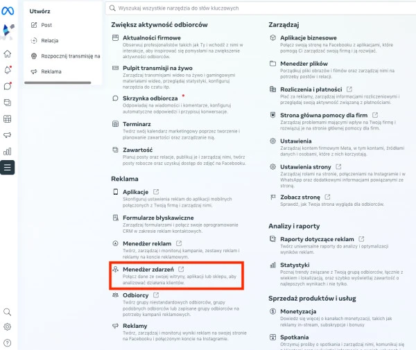 Widok narzędzi w Meta Business Suite