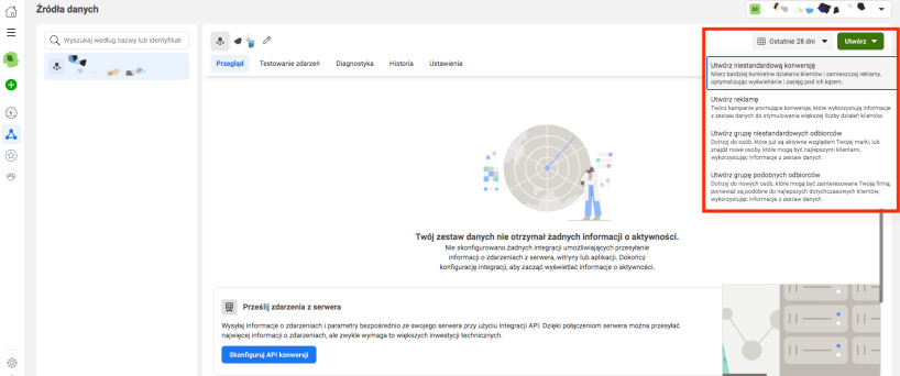 Jeśli chcesz wdrożyć Meta Pixel na swojej stronie, wykonaj konfigurację w Menedżerze Zdarzeń w obrębie Zestawów danych. Ustawiasz źródło danych dla działań przeglądarkowych, a następnie możesz je uzupełnić o śledzenie po stronie serwera przez Conversions API.