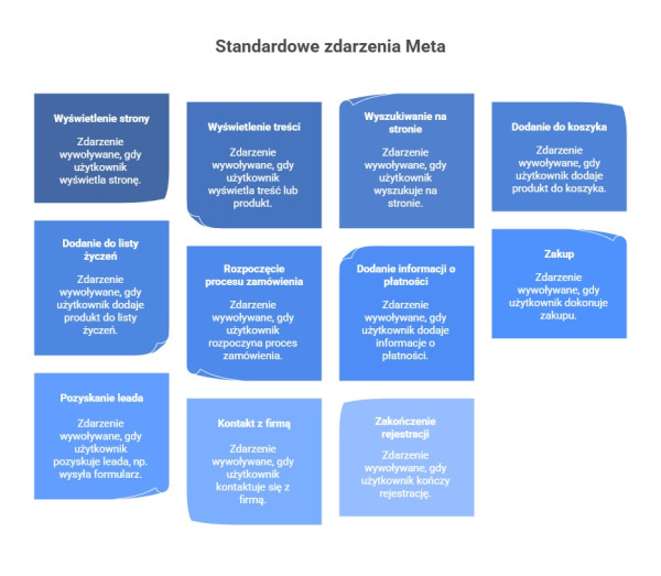 Meta udostępnia zestaw standardowych zdarzeń, które można przypisać do typowych działań użytkowników. Najczęściej wykorzystywane to między innymi: