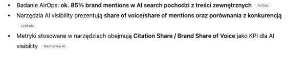W takim układzie brand mentions zaczynają pełnić zupełnie inną rolę niż dotychczas. Stają się sygnałem autorytetu, ale rozumianego szerzej i bardziej kontekstowo. Liczy się częstotliwość wystąpień wzmianki o marce, spójność narracji, sposób użycia nazwy marki oraz jej obecność w wielu niezależnych źródłach. To z tych elementów AI buduje obraz wiarygodności i kompetencji. I bardzo często to właśnie one decydują o tym, czy marka pojawi się w odpowiedzi, nawet jeśli nigdzie nie prowadzi do niej żaden link.