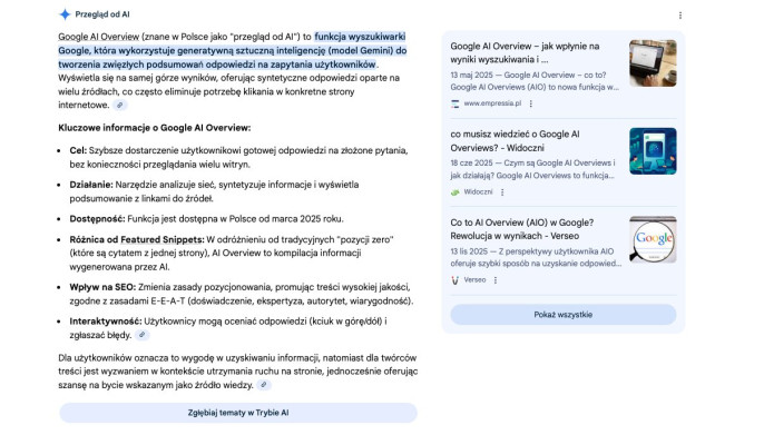 Przykład wyszukiwania Google AI Overviews.