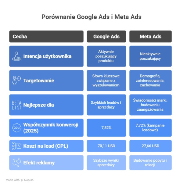 Porównanie kampanii Google Ads i Meta Ads