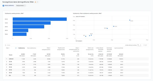 Jednym z punktów wyjścia do segmentacji odbiorców remarketingowej powinien być raport „Dane demograficzne” w GA4. Możesz wykorzystać je w optymalizacji przekazu reklamowego - np. wiek wpływa na sposób konsumpcji treści i interakcji z reklamą. Młodsi użytkownicy znacznie częściej korzystają z urządzeń mobilnych, co wymaga optymalizacji kreacji, formatów i landing pages pod mobile-first.