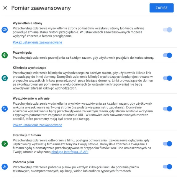 Włączanie funkcji pomiar zaawansowany w Google Analytics 4.