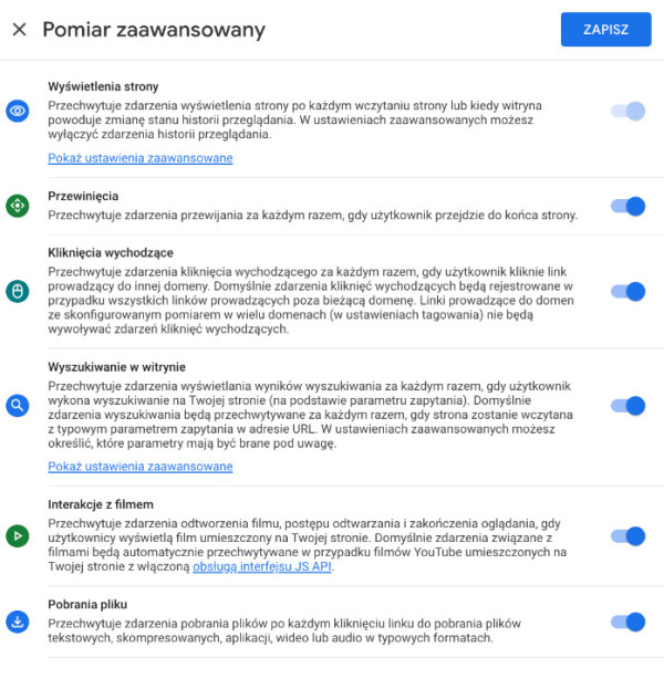 Włączanie funkcji pomiar zaawansowany w Google Analytics 4.