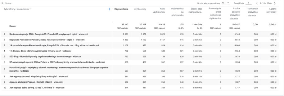 Kolejny ważny obszar analizy to raporty „Strony i ekrany”. W analityce Google Ads wykorzystasz je do oceny, czy landing page utrzymuje uwagę użytkownika i prowadzi do kluczowych zdarzeń. Dzięki zawartym w nim informacjom ocenisz, jakie treści najskuteczniej zatrzymują użytkowników i prowadzą ich w stronę konwersji. To z kolei umożliwia identyfikację podstron pełniących najważniejszą rolę w ścieżce zakupowej.